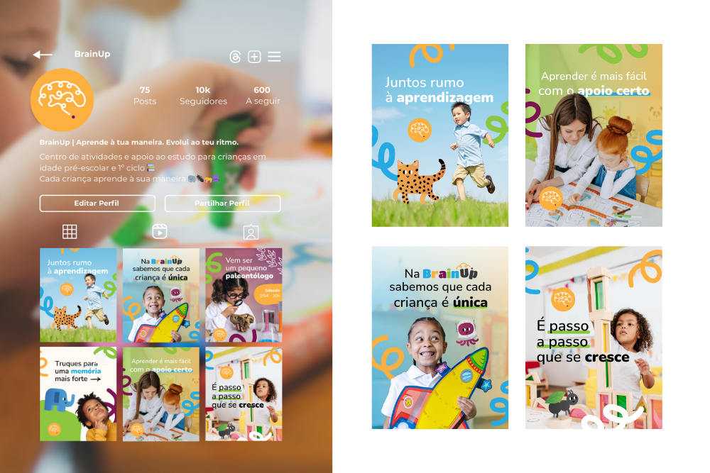 Neste projeto desenvolvemos a identidade visual da marca, criando um universo gráfico colorido, acessível e próximo do imaginário infantil. A identidade inclui logótipo, sistema de cores, personagens originais e aplicações em diferentes materiais de comunicação, desde redes sociais a merchandising e materiais educativos.