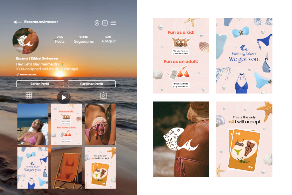 A identidade ganha vida em diferentes aplicações, desde etiquetas e padrões têxteis até conteúdos para redes sociais. O resultado é uma marca feminina e cheia de personalidade apresentada aqui como um exercício de branding exploratório inspirado no universo do swimwear.