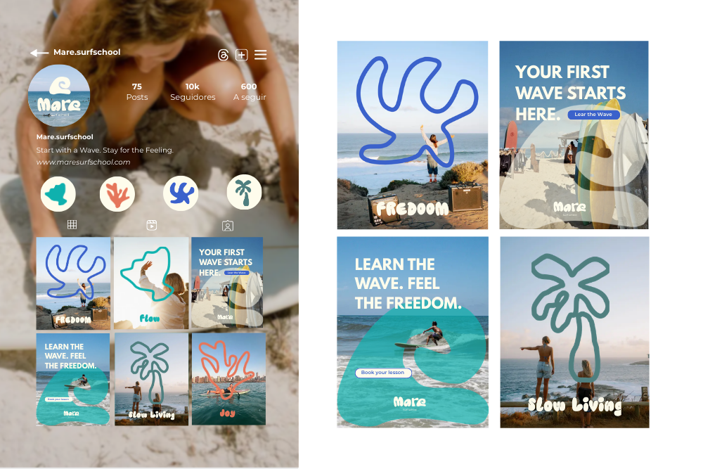 A Mare apresenta-se como uma escola de surf, mas também como um espaço onde o mar inspira uma forma diferente de viver mais livre, mais presente e em sintonia com o ritmo das ondas.