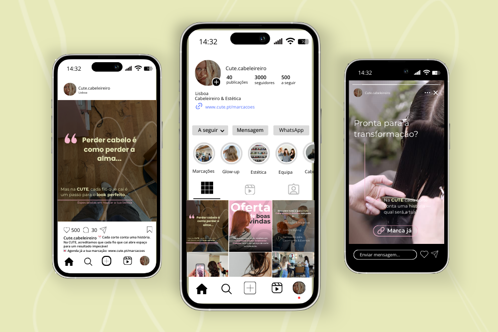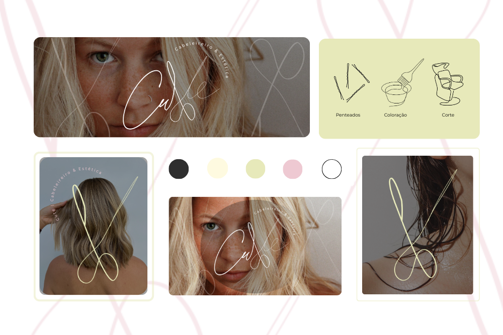 Para esta marca desenvolvemos uma identidade visual elegante e minimalista, pensada para um o espaço físico limpo e sofisticado. O traço fino do logótipo e dos elementos gráficos permite destacar a informação com delicadeza, sem competir com aquilo que é central neste universo: o cabelo, a transformação e o resultado visual. A identidade adapta-se naturalmente a diferentes pontos de contacto, desde o espaço físico e materiais de marca até à comunicação nas redes sociais.
